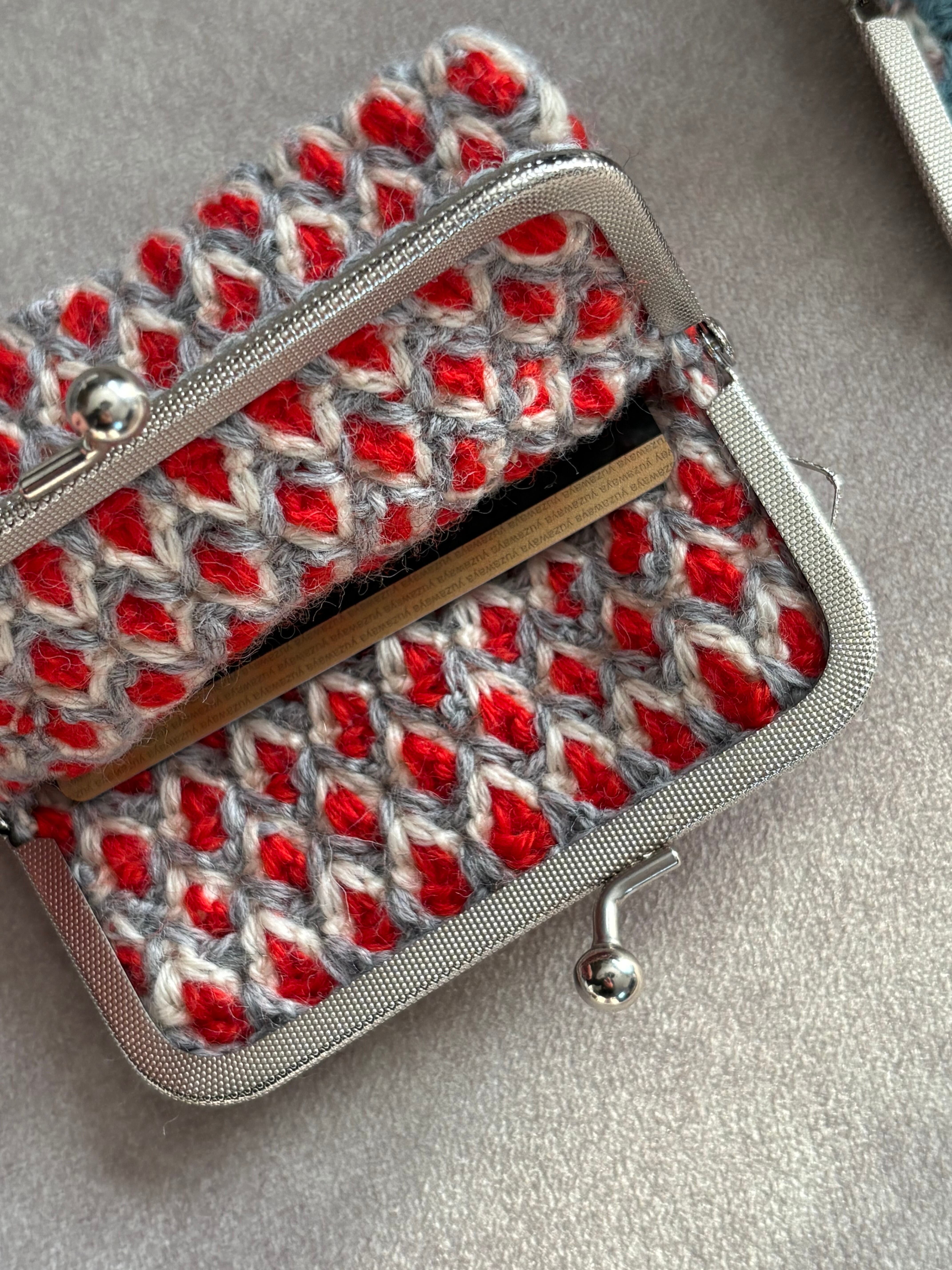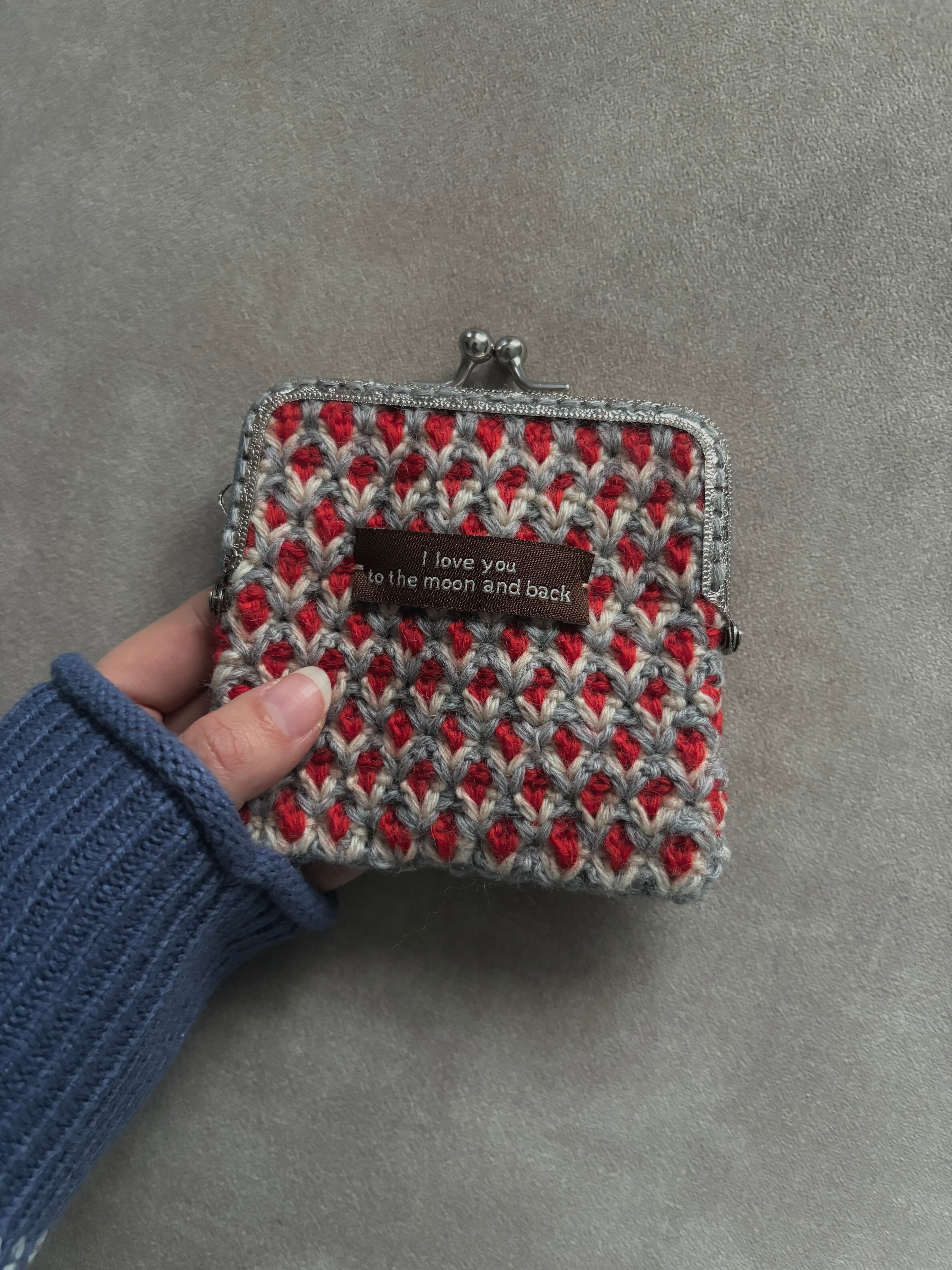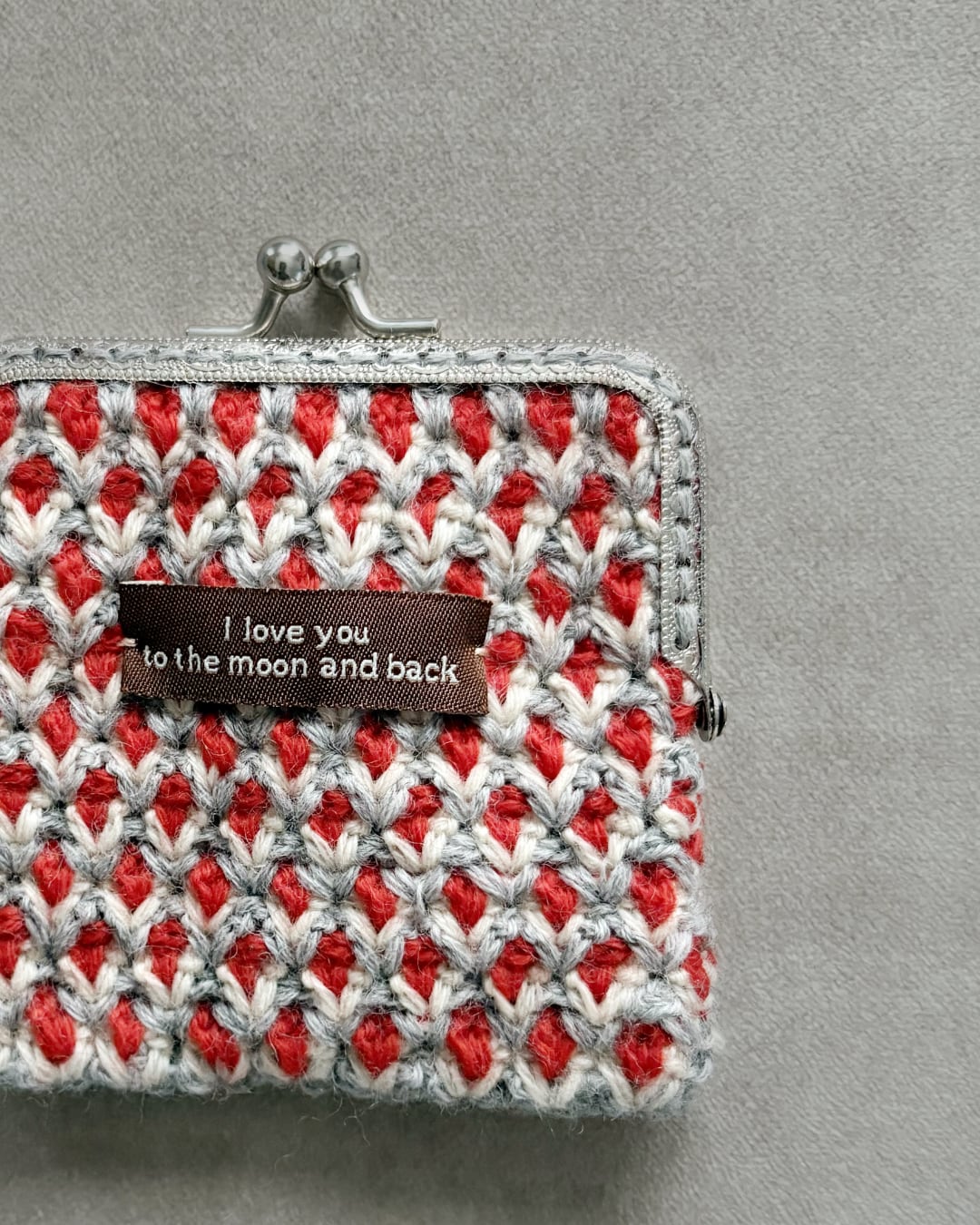 ふんわり編み模様が、お花畑のように広がるがま口ポーチ。