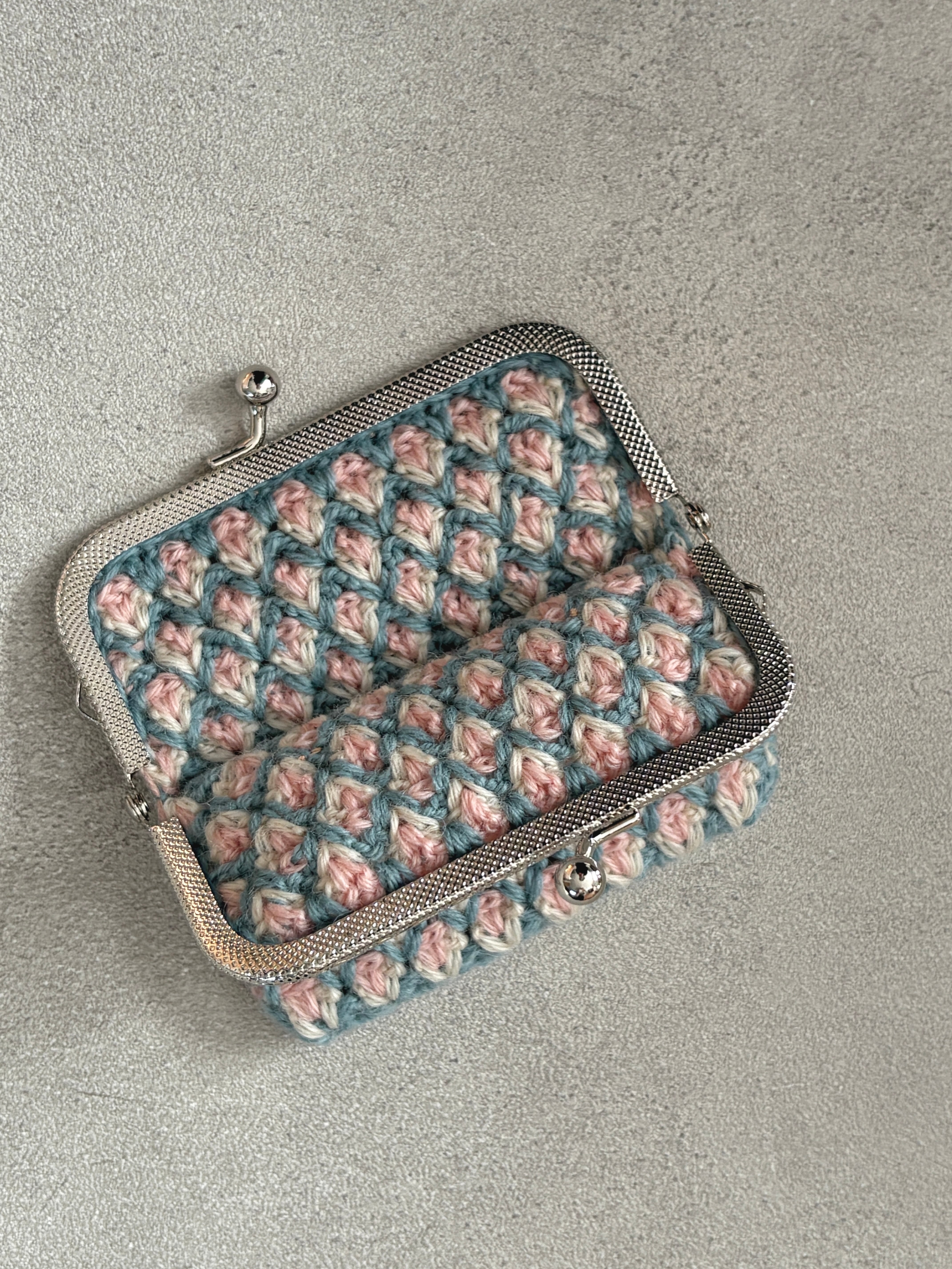 ふんわり編み模様が、お花畑のように広がるがま口ポーチ。