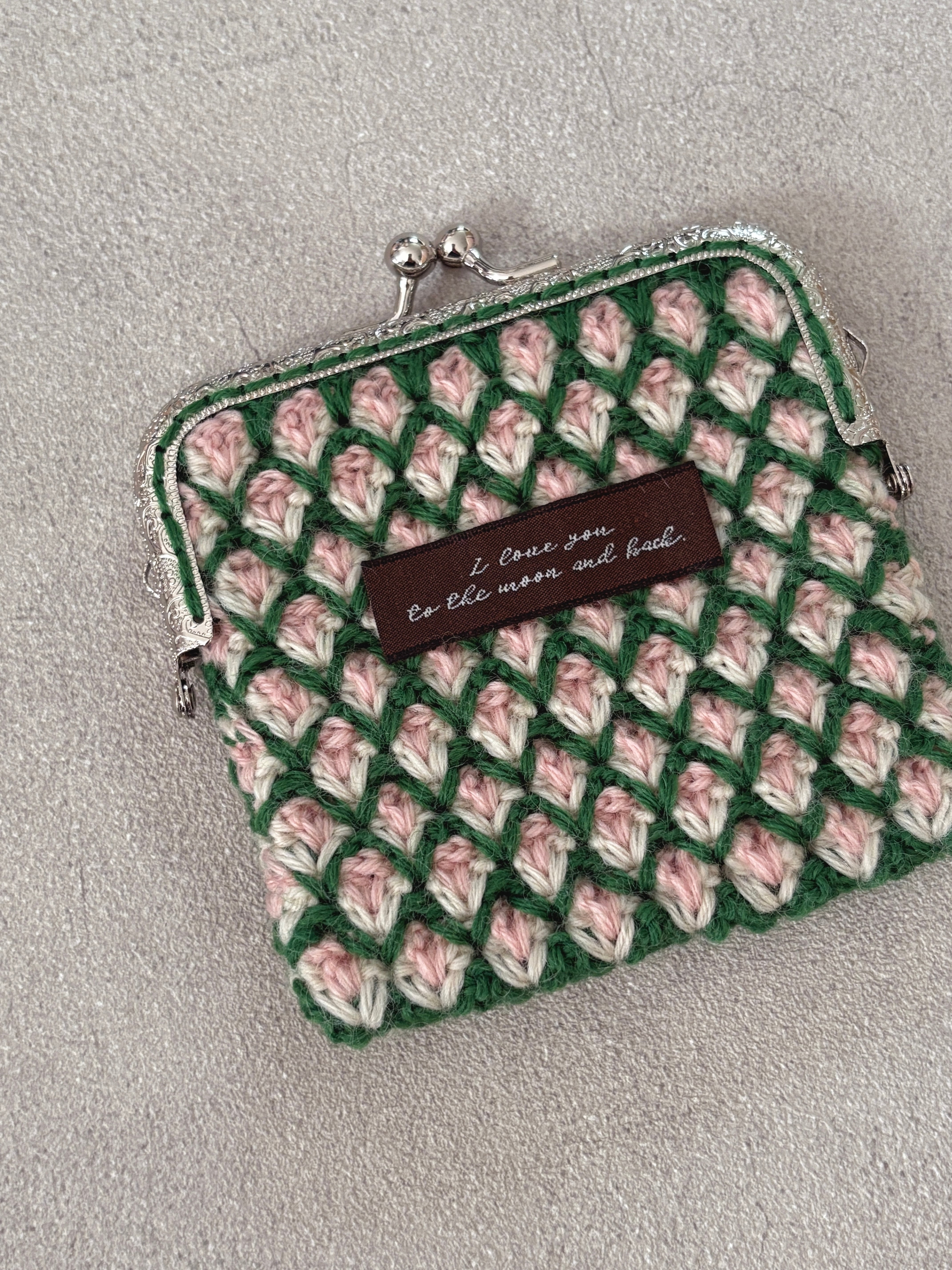 ふんわり編み模様が、お花畑のように広がるがま口ポーチ。