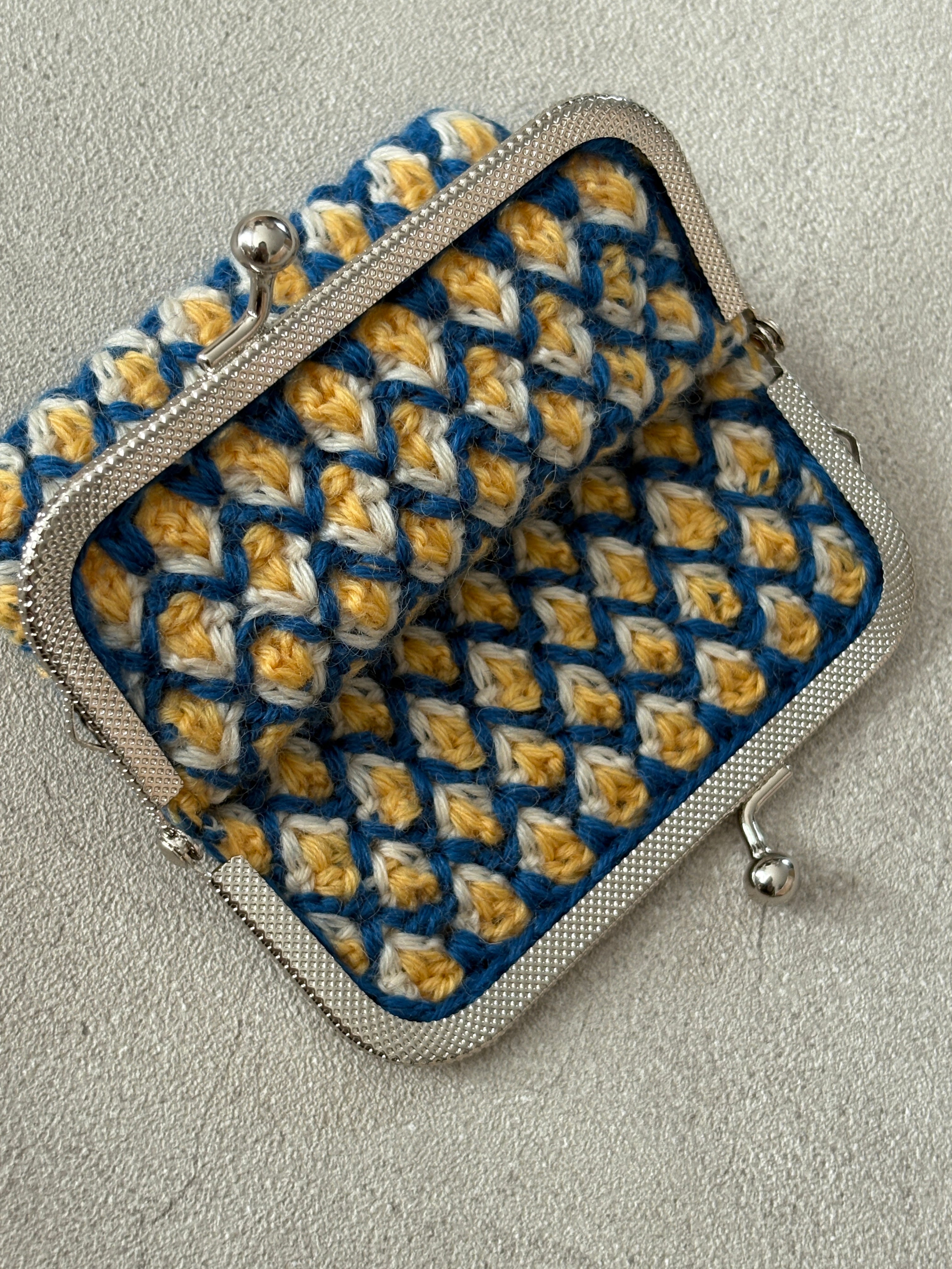 ふんわり編み模様が、お花畑のように広がるがま口ポーチ。