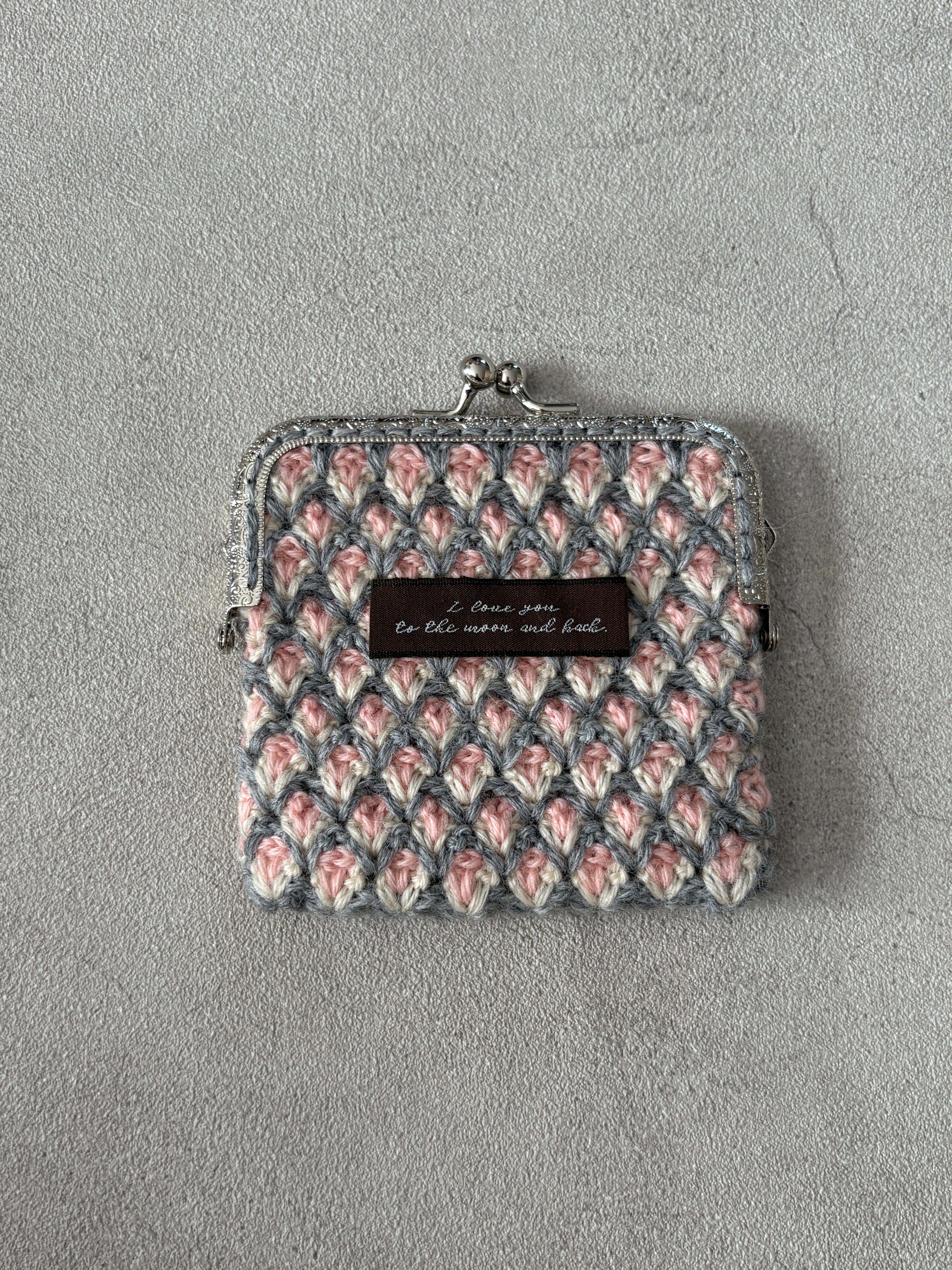ふんわり編み模様が、お花畑のように広がるがま口ポーチ。